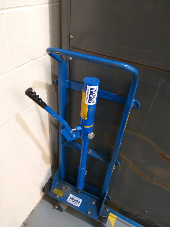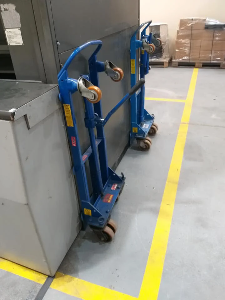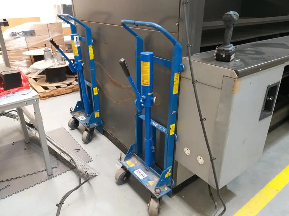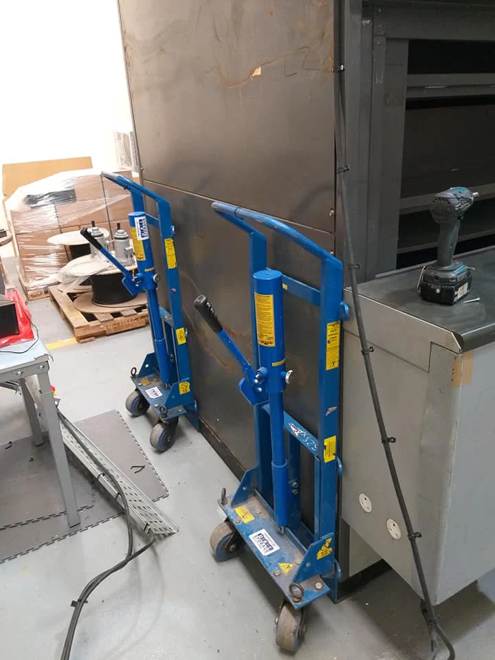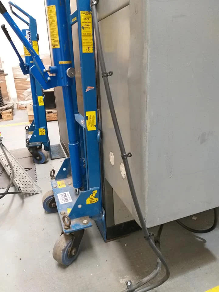 We then positioned x4 lifting shims close to each corner of the Industrial Storage Carousel. This was initially raised a few mm buy utilising a manual heavy-duty lifting tool, and then placing a heavy duty lifting scoot into the correct position. This was done four times for each corner.