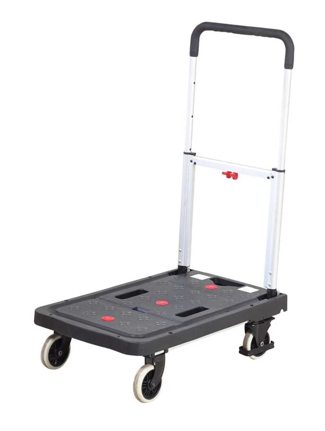 • Unique wheels which fold underneath fold underneath the platform when the handle is folded