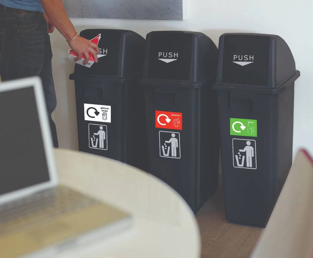 - Supplied as a set of 3 complete with 5 stickers General Waste (White), Paper (Blue), Plastic (Red), Food & Drinks Cans (Dk Grey), & Glass (Green)
